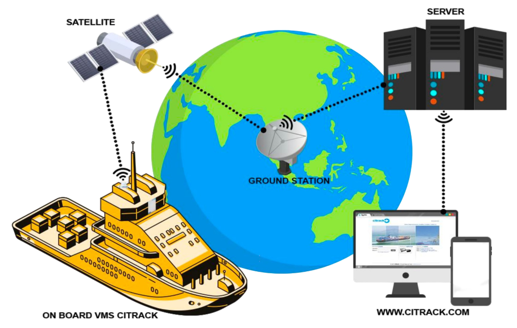 The purpose of the Vessel Monitoring System (VMS) Citrack is to enable operators and vessel owners to access critical real-time information from ships in operation, allowing them to make timely, crucial decisions such as optimizing arrival times, controlling fuel consumption, monitoring engine conditions, improving engine maintenance efficiency, and more.